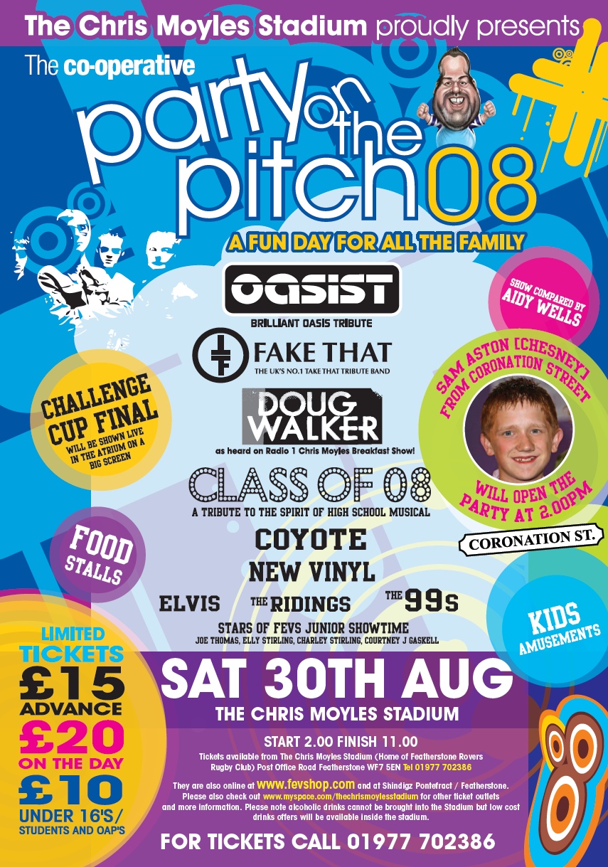 On Saturday 30th August the Chris Moyles Stadium, home to the Featherstone Rovers Rugby Club, will be hosting the 'Party on the Pitch'. You can look at the flyer below for details, and will have a chance to look around the stadium. Who knows, Chris may even be there ...