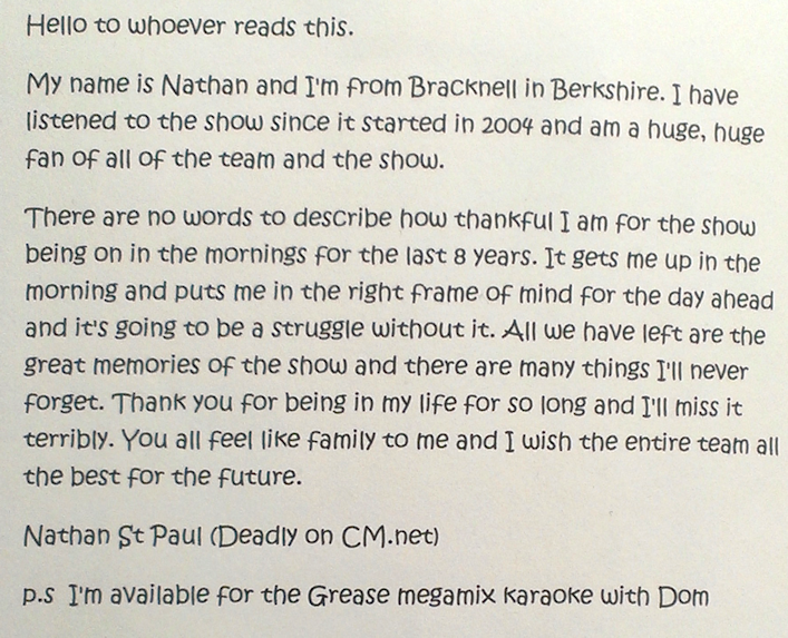 You probably don't remember me, nor know who I am- but since today is the last ever show in the mornings, I just thought I'd write this message to you guys. I've been a listener to the show for many, many years now- and in a very weird way, I just wanted to share with you my story about how the show has changed my life.