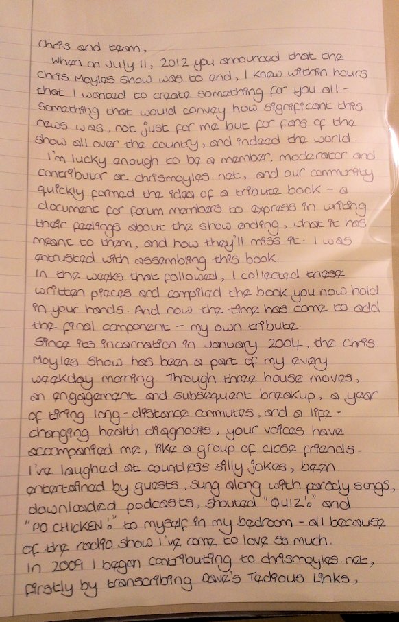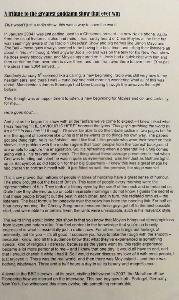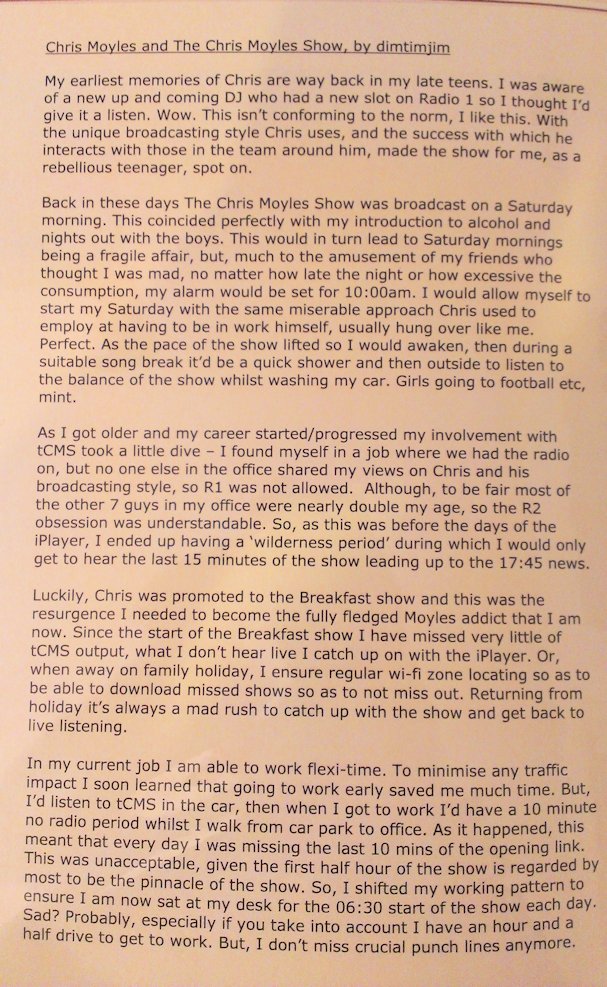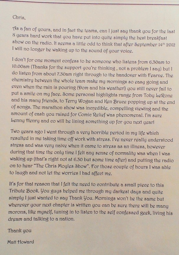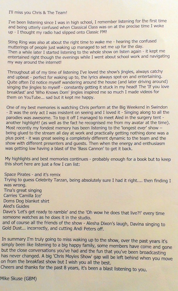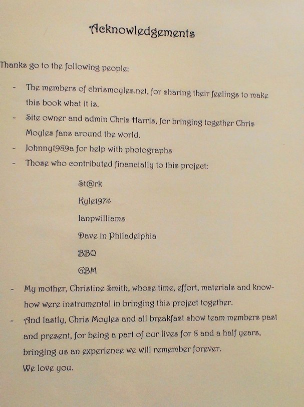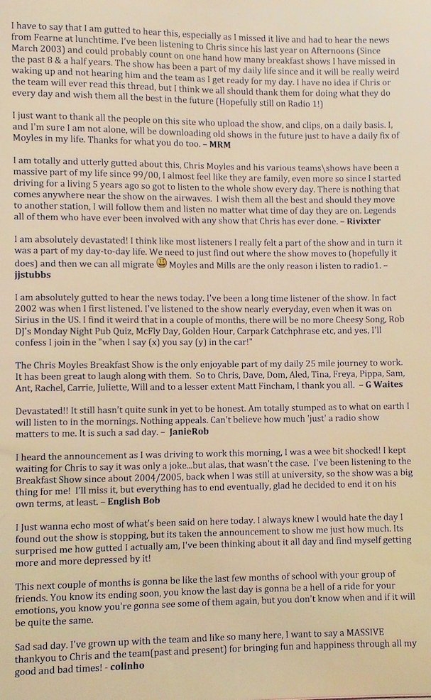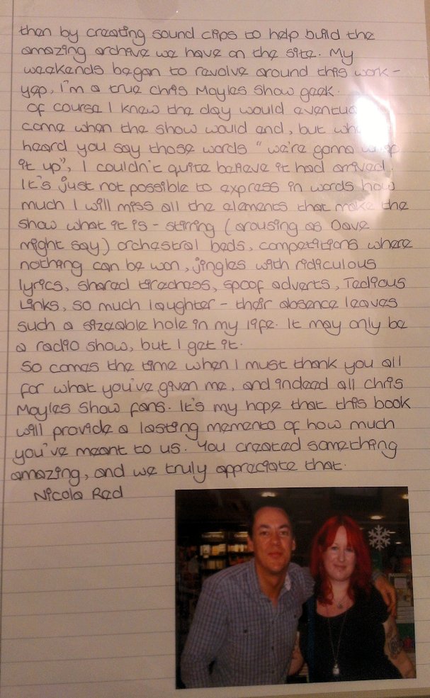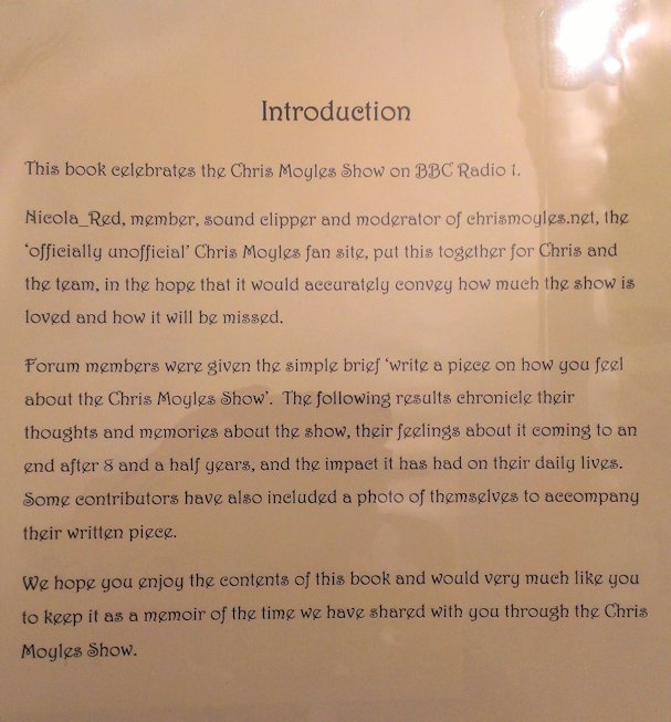 In August and September 2012 Nicola_Red solicited input for a tribute book which was sent to the Chris Moyles Breakfast Show team to mark the end of their record-breaking and award-winning breakfast show run.