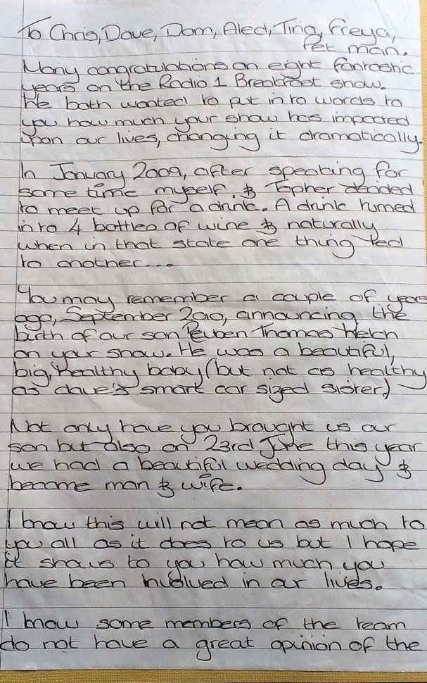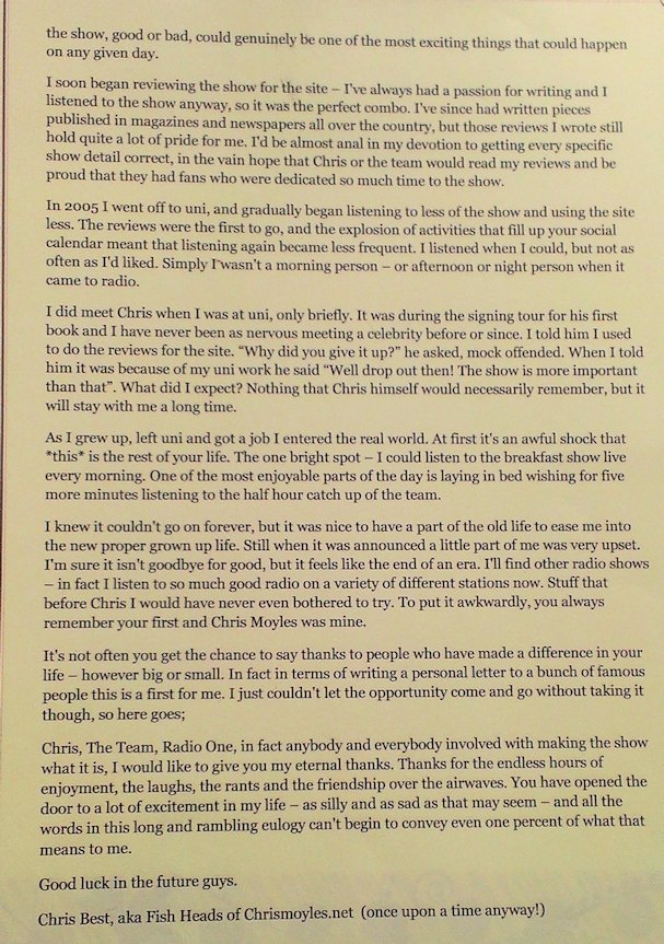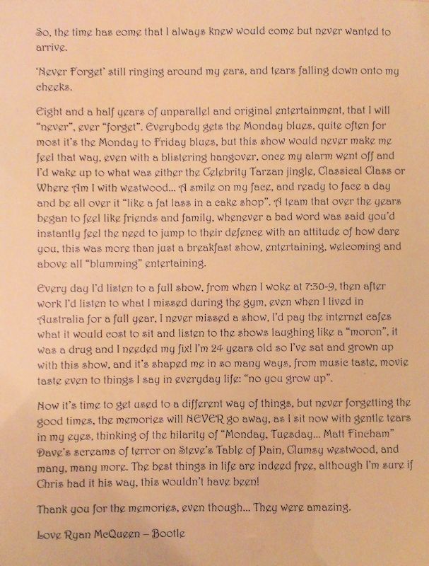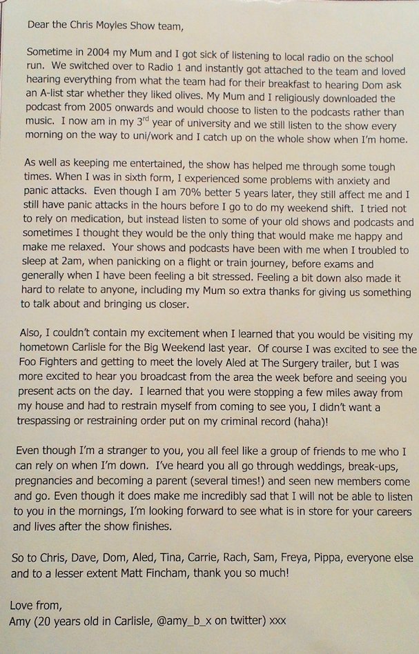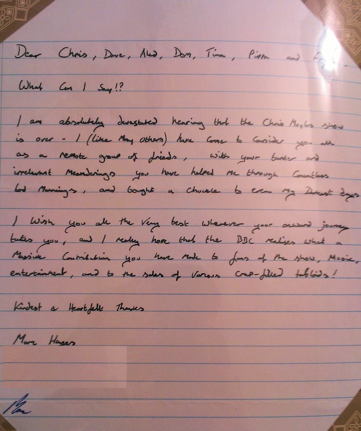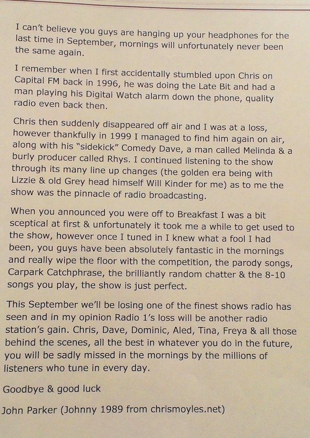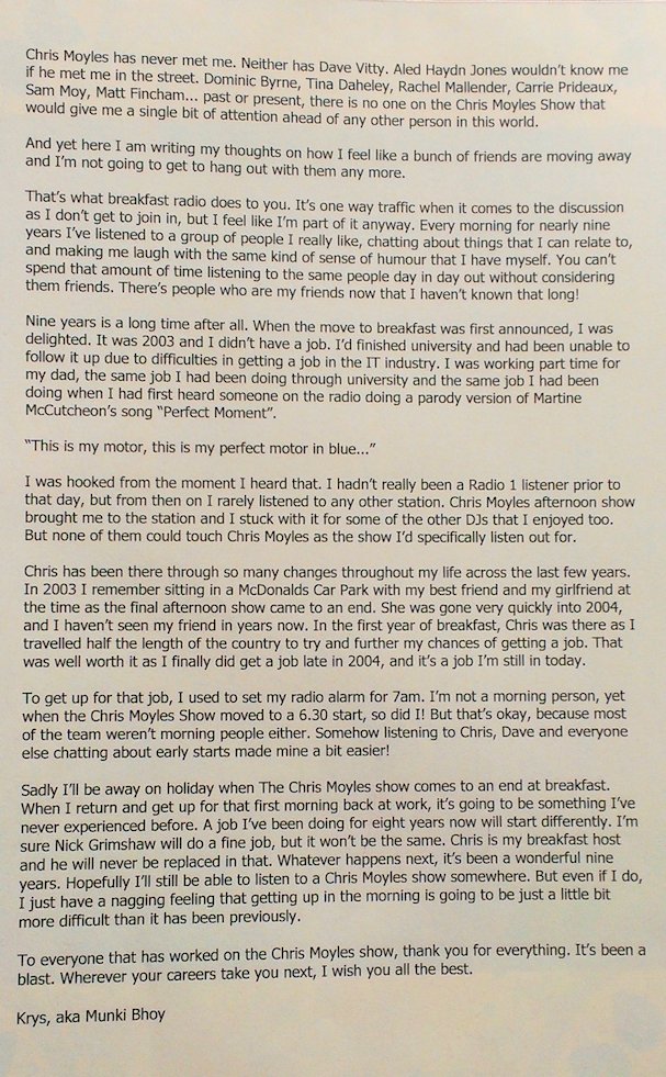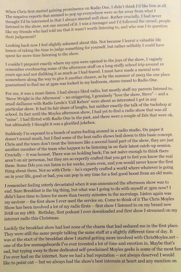 In August and September 2012 Nicola_Red solicited input for a tribute book which was sent to the Chris Moyles Breakfast Show team to mark the end of their record-breaking and award-winning breakfast show run.