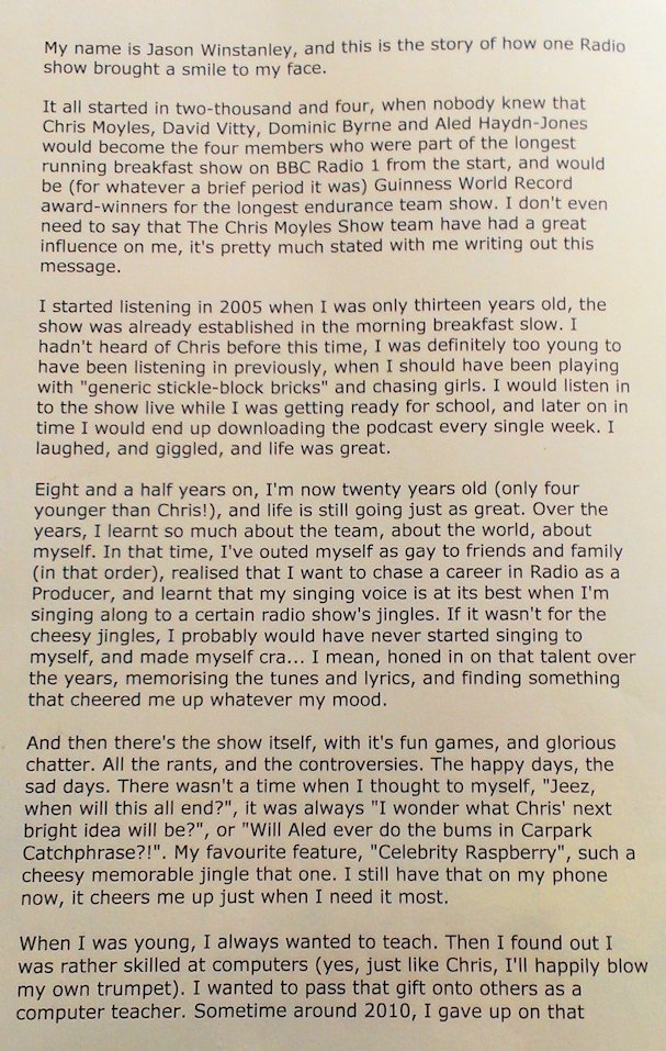 I started listening when a friend of mine introduced me to the cheesy song, over 4 years ago. At the start of my listening, I wasn't happy with life. I'd just spent a year re-sitting after failing my GCSEs, I was convinced I was thick, I had no friends at college, no social life outside of it and would spend my lunchtimes sat in front of a computer screen waiting for the next lesson. But anybody who knew me would tell you about my apparent obsession with The Chris Moyles Show.