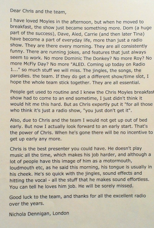 Well I now need a new job closer to home. Sounds cliched but listening to Moyles really made my commute so much easier! Truly gutted. - jocky85