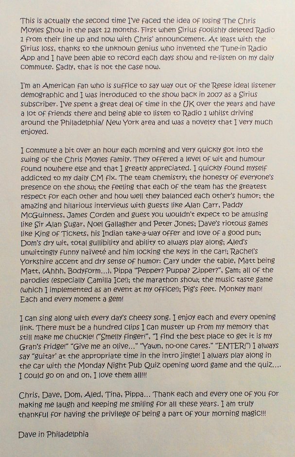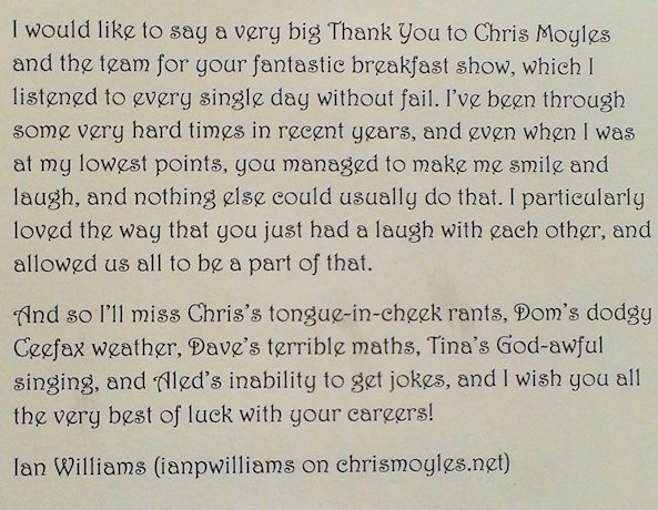 The Chris Moyles Breakfast Show is the only enjoyable part of my daily 25 mile journey to work. It has been great to laugh along with them. So to Chris, Dave, Dom, Aled, Tina, Freya, Pippa, Sam, Ant, Rachel, Carrie, Juliette, Will and to a lesser extent Matt Fincham, I thank you all. – G Waites