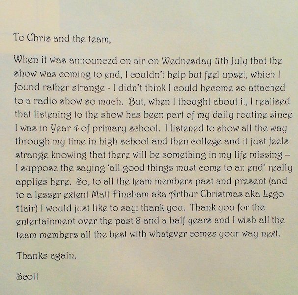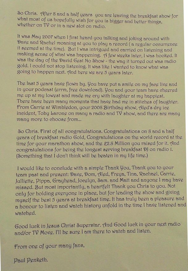 It's perhaps difficult for people who are intimately involved in Radio to understand the impact that they will have had on their listeners, not just while they were on-air but even years later. I still remember the Radio One breakfast shows as I grew up, left home, went to University (okay, so less of them there) and eventually went to work. For so many people there will be a particular song, a voice or perhaps a place that will suddenly stir a memory of a conversation or moment that they heard on the radio. For Chris and the team as they spent longer than anyone else accompanying people on these early morning activities, those moments will be many and frequent. The show may have finished but it will live on.