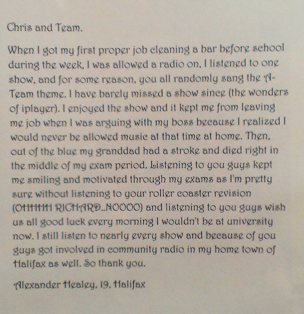 I feel lucky and proud that I've managed to have a few texts read out that have lead to further discussions.  One was a joke I text in that Aled read out, and I remember feeling bad because that link focused on laughing at Aled because he didn't 'get it', but that's what the show was and did, so I'm also kind of proud of it.
